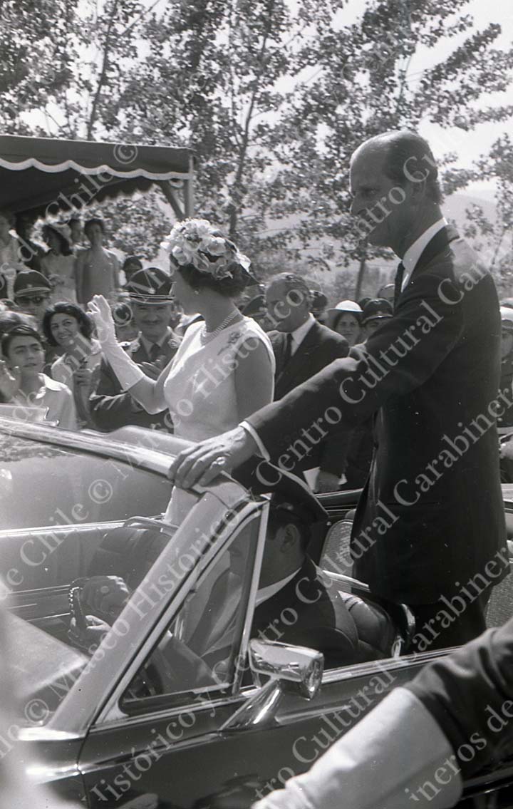 La Reina Isabel II del Reino Unido, junto a su esposo el Príncipe Felipe de Edimburgo, llegan al Club La Dehesa para asistir a la presentación del Cuadro Verde de Carabineros de Chile a bordo de un automóvil Ford Galaxie 500 XL descapotable, escoltado por personal motorizado de la policía uniformada.