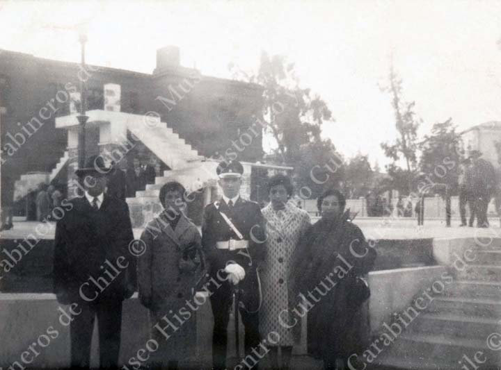 El Aspirante a Oficial Hernán Merino Correa (al centro, de uniforme), junto a su familia. En el extremo izquierdo se aprecia a su padre, Carlos Merino, y en el extremo derecho a su madre, Ana Correa.
