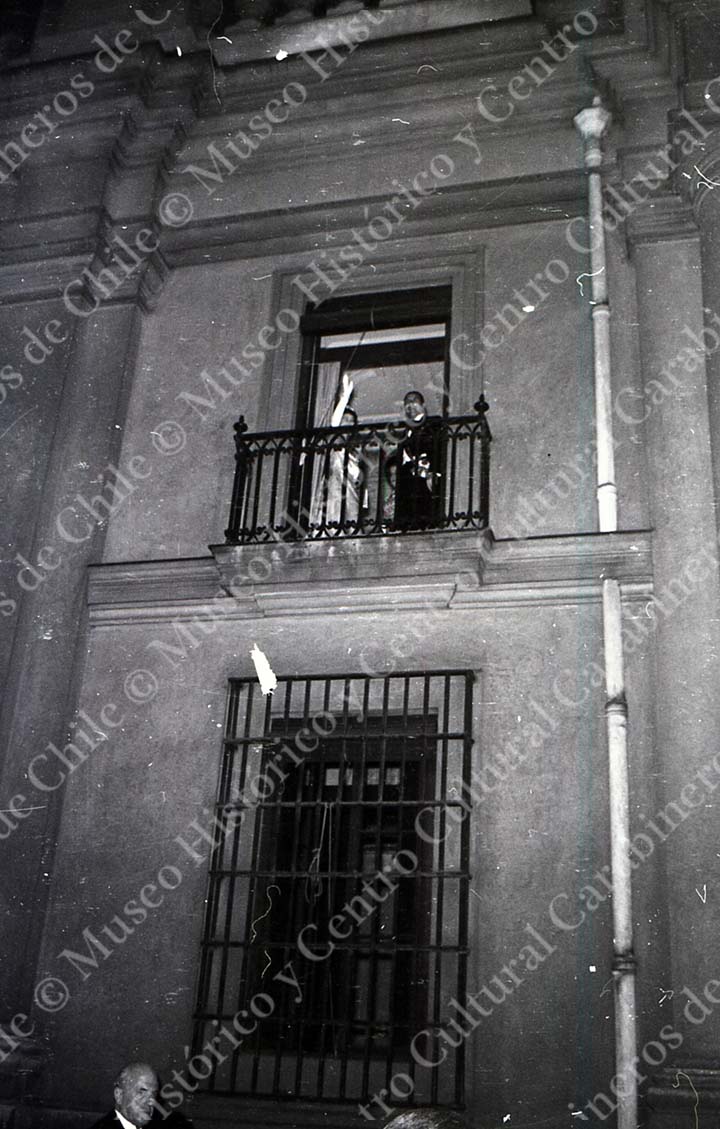 La Reina Isabel II del Reino Unido y el Presidente de la República Eduardo Frei Montalva, saludan desde un balcón del Palacio de la Moneda la noche de la cena de gala ofrecida por el mandatario chileno en honor de la soberana británica en visita oficial al país.