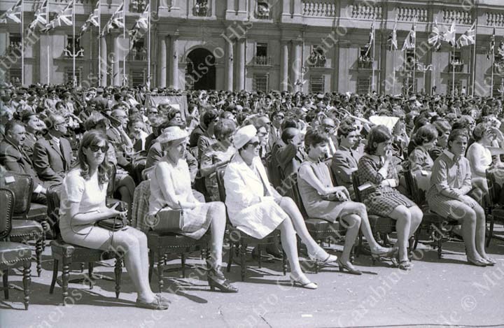 Público asistente a la primera actividad oficial de la Reina Isabel II del Reino Unido en Chile: la declaración de Huésped de Honor de la ciudad de Santiago de la soberana en el frontis del Palacio de la Moneda por parte de la Municipalidad de la capital, encabezada por el Alcalde Manuel Fernández Díaz.